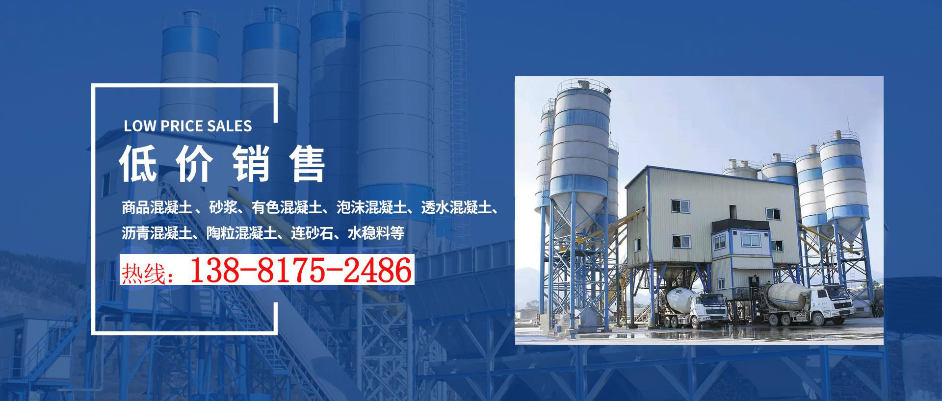 ———— 主要銷(xiāo)售:商品混凝土、砂漿、有色混凝土、泡沫混凝土,透水混凝土、C15混凝土、C20混凝土、C25混凝土 ————